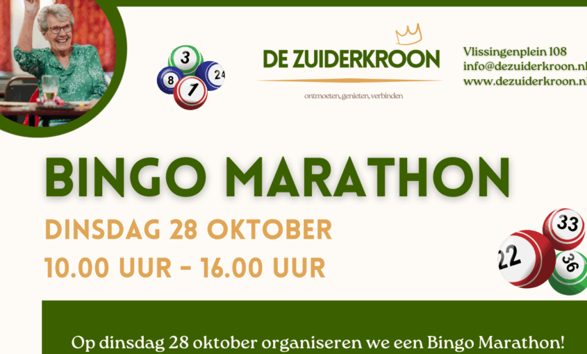 Op dinsdag 28 oktober organiseren we een Bingo Marathon! Van 10:00 tot 16:00 uur worden er doorlopend bingospellen gespeeld, met volop kansen om cadeaukaarten te winnen! 6 uur lang bingo-plezier! Inclusief een lunch ️Maximaal 50...