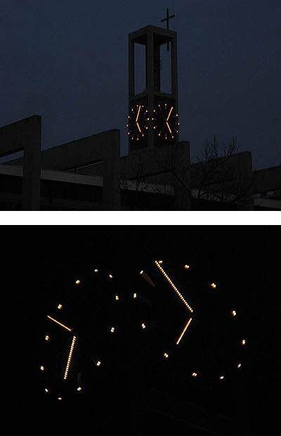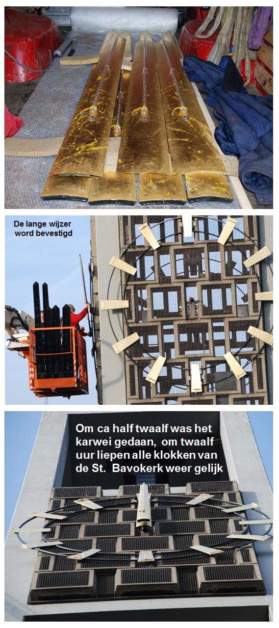 Andries Haak maakte bijgaande foto’s. Er is ook een Powerpointversie van en daarin zitten nog meer foto’s. Het verstevigen van de wijzers is in een paar dagen gefikst. Om half twaalf hing alles op zijn plek en om twaalf uur liepen de klokken weer allemaal op tijd.