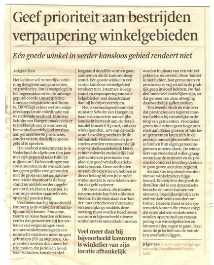Datum: 17-09-2011 Eén goede winkel in verder kansloos gebied rendeert niet schrijft de secretaris vestigingszaken bij Detailhandel Nederland in een artikel in het Financieel Dagblad van 17 september (is een poosje geleden, maar toch interessant als het over de winkels op Plein 1953 gaat) Het kabinet wil ruimtelijke ordening delegeren aan gemeenten en provincies. Dat