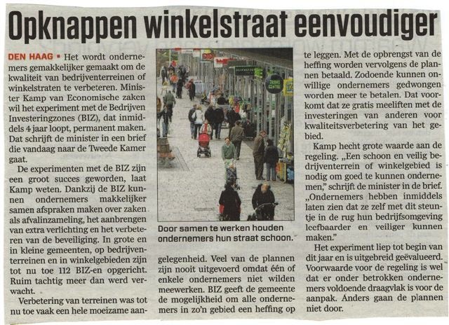 Read More...Coen Veldhoen pikte bijgaand bericht van het ministerie van Economische Zaken uit de krant. Minister Kamp wil de experimentele regeling BIZ (Bedrijven Investeringszones) permanent maken. Iets voor de ondernemers rondom Plein 1953?