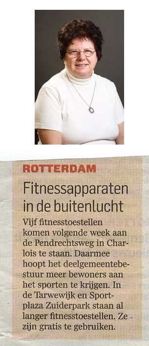 Op 19 november om 16. 00 uur onthullen voormalig deelraadslid Agnes Morene en deelraadsvoorzitter Ed Goverde vijf nieuwe fitnesstoestellen aan de Pendrechtseweg. U bent van harte uitgenodigd daarbij aanwezig te zijn. Locatie: Pendrechtseweg hoek Oldegaarde.Deze toestellen staan in de buitenlucht en zijn gratis te gebruiken. De toestellen zijn een aanvulling op de fitnessapparatuur in de