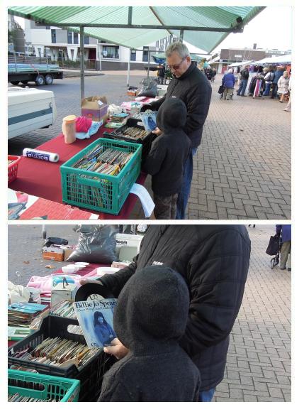 Tafereel op de snuffelmarkt van zaterdag 27 oktober 2012. Ook daar kun je leren en wordt les gegeven.Hij pakte een plaatje uit de doos op de marktkraam. Hij vroeg zijn kleinzoon: ‘Weet je wat dit is?’ Hij wachtte het antwoord niet af. ‘Dit is een singeltje. Dat kon je op een platenspeler leggen. Oh, ja,