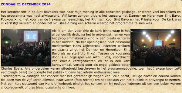 Naar de mening van dagburgemeester Mario Bosch was het kerstconcert in de Sint Bavokerk in alle opzichten geslaagd. Een afwisselend sfeervol programma voltrok zich voor zijn ogen.Op zondag 21 december 2014 scheef Mario Bosch in zijn webolg: Het kerstconcert in de Sint Bavokerk was naar mijn mening in alle opzichten geslaagd, er waren veel bezoekers