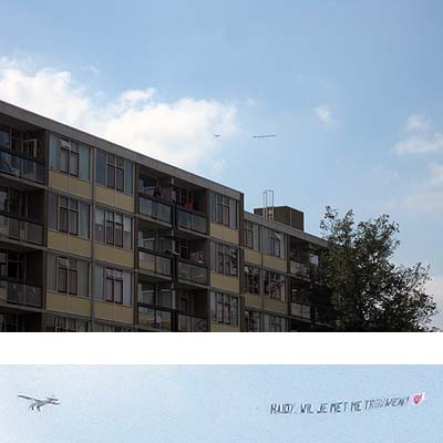Zaterdagmiddag vloog er een klein reclamevliegtuigje boven de wijk maar de tekst op de banner was wel een heel persoonlijke boodschap, gericht aan een specifiek persoon.Zaterdagmiddag is het gezellig druk op Plein 1953. Bewoners doen hun boodschappen, kinderen spelen bij de walvis en koopjesjagers lopen rond op de snuffelmarkt. Rond twee uur is het geluid
