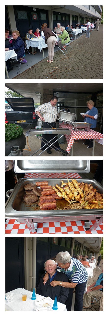 Ze laten zich door niets uit het veld slaan, het team van de Zuiderparkflat. Ook dit jaar werd de barbecue weer een groot succes.De boodschappen gedaan, de tafels en stoelen stonden voor alle zekerheid weer onder de galerij van de flat. Dat was maar goed ook want precies om 16.00 uur brak er een enorme