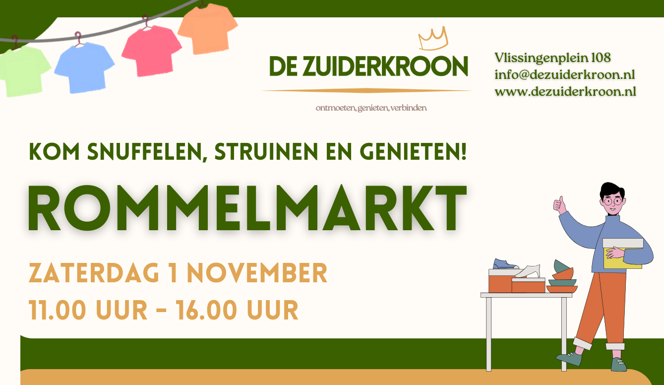Ben je op zoek naar leuke koopjes, vintage schatten of gewoon een gezellige middag in de wijk? Kom dan naar onze rommelmarkt in De Zuiderkroon!